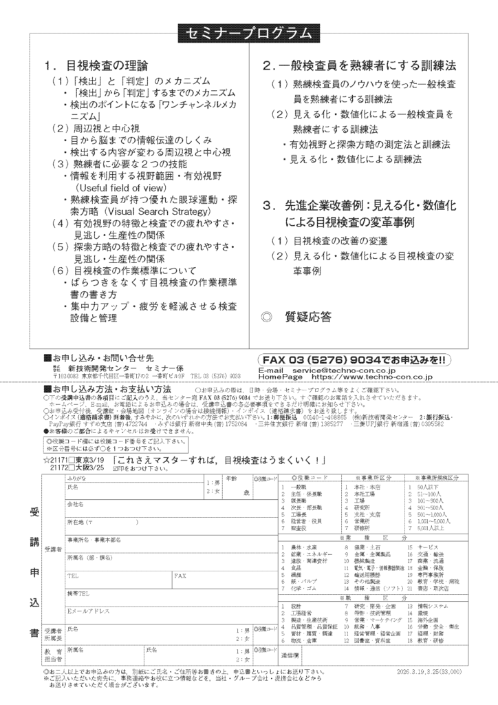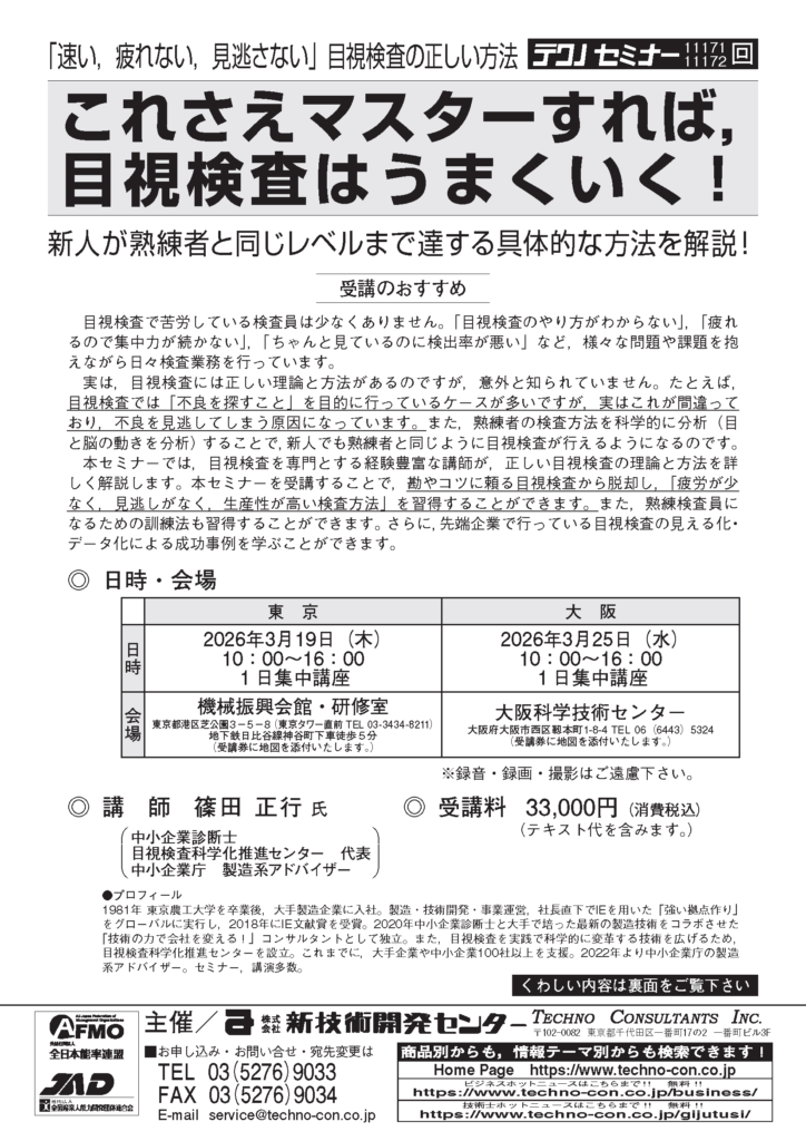 株式会社新技術開発センター主催「これさえマスターすれば、目視検査はうまくいく!」2026年3月25(水)・対面・大阪開催